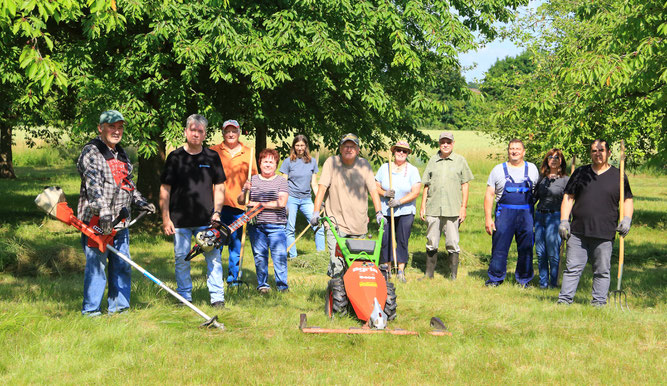 Die Nabu-Gruppe Limeshain führt die Pflege der gemeindeeigenen Flächen am Wilhelmsbrunnen bereits seit einigen Jahren durch. Die erforderlichen Mäharbeiten der Streuobstwiese auf diesem Gelände werden von der Firma Eyrich durchgeführt. Es bleiben aber noch genügend Flächen zwischen den Bäumen und Büschen, die von den großen Maschinen nicht gemäht werden können. Hier muss die Naturschutzgruppe selber Hand anlegen. Mit der Handmähmaschine ist dies zwar gut durchführbar, aber dennoch ein großes Stück Arbeit und besonders schweißtreibend an diesem sonnigen Tag im Juni. Die Vorstandsmitglieder Andreas Kempf, Benjamin Bellach, Monika Ditter, Egon Siebert, Manfred Junker, Karin und Manfred Vogt wurden unterstützt von Marion und Helmut Kowarsch, Marina und Volker Weber und Jamil Alaouda.